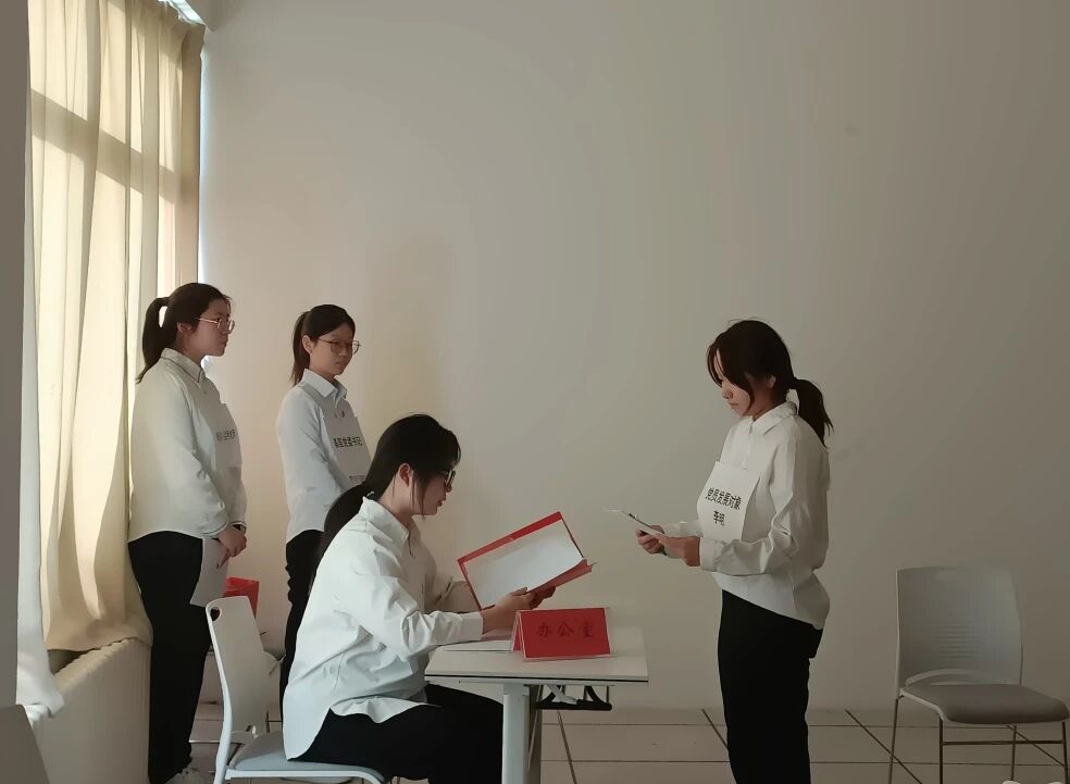 三组同学围绕党员发展的第四环节——预备党员的接收展开演绎。不论是基层党委预审还是部门联审,都体现着党员发展的严肃性,敦促大家在日常工作和学习中,要以高标准严格要求自己,作风务实严谨。